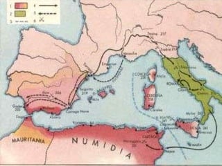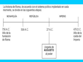 Roma se ubicó en la península itálica, limitada por los Alpes, el mar Tirreno, el mar Adriático y el Mediterráneo. Pasó por tres etapas: la Monarquía (753-509 a.C.), la República (509-31 a.C.) y el Imperio (31 a.C.-476 d.C.). La República se expandió por el Mediterráneo y conquistó nuevos territorios, pero entró en crisis por las luchas entre patricios y plebeyos. Julio César centralizó