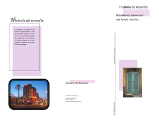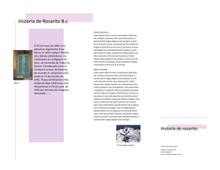 El documento describe la historia de Rosarito, Baja California. El nombre Rosarito se deriva de El Rosario y se le dio originalmente a una ranchería indígena a finales del siglo XVIII. En 1885, las tierras fueron adjudicadas legalmente a Joaquín Machado y otros herederos. Esto se considera la fundación virtual de Rosarito. Oficialmente, Rosarito se estableció como municipio el 29 de junio de 1995 por decreto del congreso del estado.
