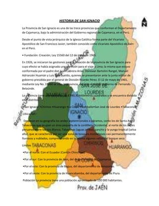 Este documento resume la historia y características de la provincia de San Ignacio en Perú. Se fundó en 1965 y tiene una extensión de 4,990 km2 dividida en 7 distritos. Sus principales actividades económicas son la agricultura (café y cacao), ganadería, apicultura y turismo. Celebra varias fiestas a lo largo del año, incluyendo el Día de la Provincia el 12 de mayo y el día de su santo patrón el 31 de julio.