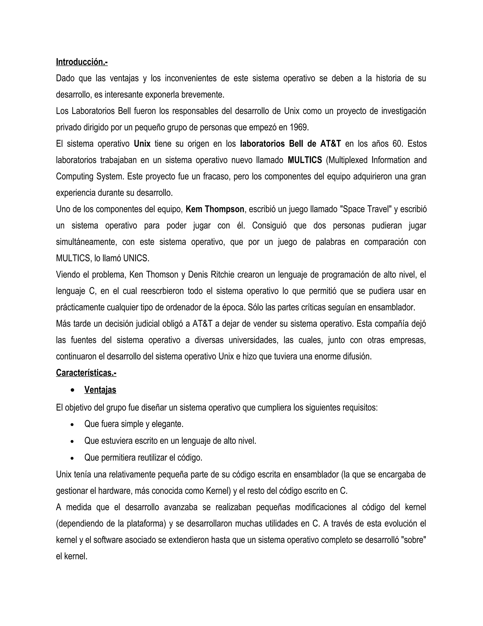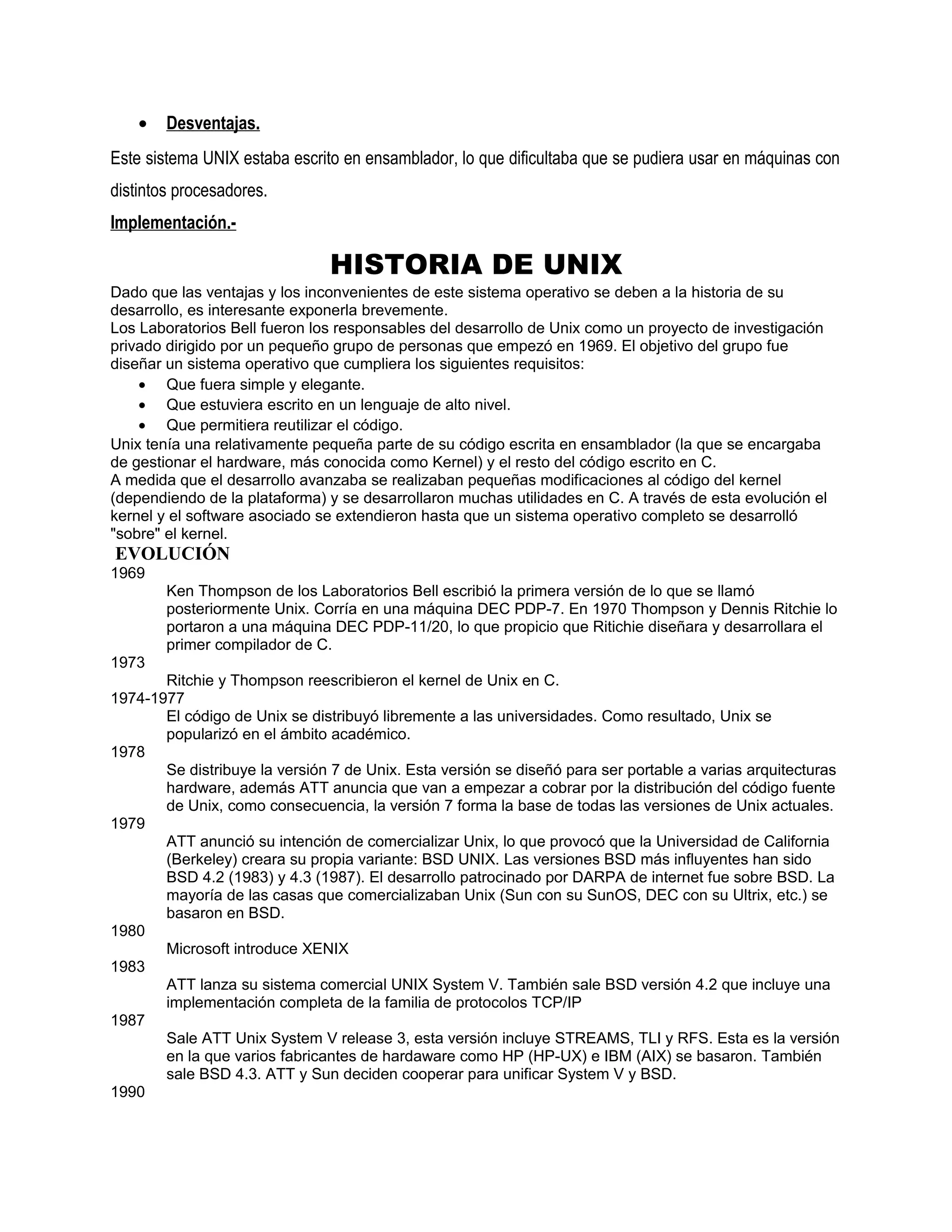 El documento describe la historia del desarrollo de Unix. Comenzó en 1969 cuando Ken Thompson de los Laboratorios Bell escribió la primera versión de Unix en un DEC PDP-7. Luego, Thompson y Dennis Ritchie lo portaron a un PDP-11/20 y Ritchie diseñó el primer compilador C. Más adelante, Ritchie y Thompson reescribieron el kernel en C. A medida que avanzaba el desarrollo, se realizaban modificaciones al kernel y se desarrollaron utilidades en C, dando como resultado un sistema operativo completo