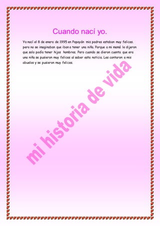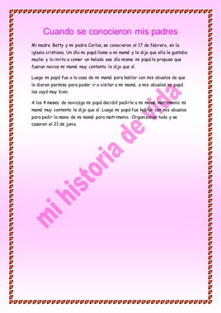 Mi madre Betty y mi padre Carlos se conocieron en una iglesia cristiana en febrero. Mi padre invitó a mi madre a salir y se hicieron novios. Cuatro meses después, mi padre le pidió matrimonio a mi madre, quien aceptó. Se casaron en junio. En enero de 1995 nací yo en Popayán, para la sorpresa de mis padres que esperaban un niño. Más tarde nació mi hermano.