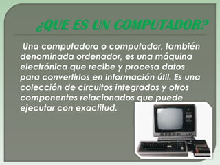 Una computadora es una máquina electrónica que recibe datos y los procesa para convertirlos en información útil. Las primeras computadoras usaban válvulas de vacío, mientras que las siguientes generaciones usaron transistores y circuitos integrados, haciéndolas más pequeñas y eficientes. Las computadoras modernas se basan en los microchips, lo que permitió el desarrollo de las computadoras personales.