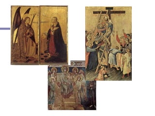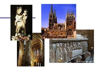 El documento describe el arte gótico en Europa occidental entre los siglos XII y XVI. Se caracterizó por catedrales más grandes y luminosas que las iglesias románicas, con arcos apuntados, bóvedas de crucería y contrafuertes. La escultura se volvió más expresiva y la pintura más naturalista. Las vidrieras también florecieron, llenando las catedrales góticas de color.