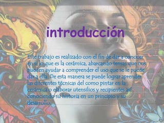 Este documento trata sobre la historia y tipos de cerámica. Explica que la cerámica se refiere a objetos hechos de barro, loza y porcelana. Luego resume que la cerámica se desarrolló durante la revolución neolítica para almacenar cosechas y que inicialmente se modelaba a mano antes de ser decorada. Finalmente, clasifica los tipos de cerámica en porosa, semicompacta, compacta y tenaz según sus propiedades de permeabilidad y resistencia.