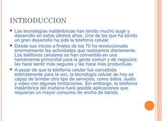 El documento trata sobre la historia y desarrollo de la tecnología celular. Explica que desde finales de los 70 ha revolucionado las actividades diarias y que los teléfonos celulares se han convertido en una herramienta primordial. Describe las cuatro generaciones de telefonía celular y sus características, desde la primera generación analógica hasta la tercera generación con capacidad multimedia e Internet móvil. También explica brevemente cómo funciona un teléfono celular y sus componentes internos.
