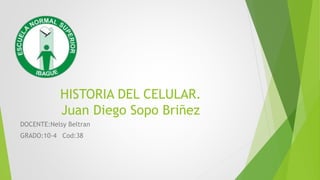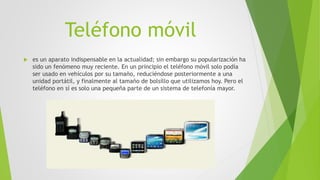 El documento resume la historia del teléfono celular desde sus orígenes hasta la cuarta generación actual. Comenzó como un teléfono grande y pesado que solo podía usarse en vehículos, luego se hizo más pequeño y portátil. La primera generación analógica se introdujo en 1973, mientras que la segunda generación digital trajo mejoras como la multiplexación y nuevos servicios como los mensajes multimedia. La tercera generación permitió mayores velocidades de datos para servicios como Internet móvil. La cuarta generación como LTE ofrece aún más ancho de band