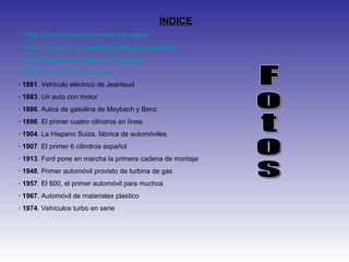 El documento resume la evolución de los vehículos desde 1769 hasta 1974, destacando hitos como la creación del primer vehículo de vapor en 1765, el desarrollo de los primeros motores de combustión interna en la segunda mitad del siglo XIX, la introducción del montaje en cadena por Ford en 1913, y el lanzamiento de los primeros vehículos turbo en 1974. Cubre los orígenes de los vehículos a vapor y de gasolina, así como innovaciones clave en motores y procesos de fabricación.