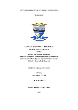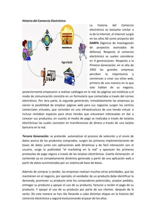 El documento resume la historia y evolución del comercio electrónico desde sus inicios en la década de 1990 hasta la actualidad. Explica las cuatro generaciones del comercio electrónico y cómo ha pasado de simples catálogos en línea a transacciones completamente automatizadas. También define el comercio electrónico, discute sus ventajas y desventajas para empresas y consumidores, y analiza la importancia creciente de la informática y el internet para los negocios modernos.