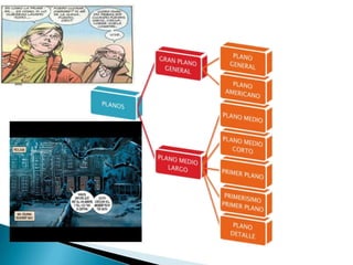 El documento describe las características principales de los cómics, incluyendo que se trata de un medio expresivo que combina imágenes fijas y texto, con una historia ilustrada. Los cómics han evolucionado a lo largo de siglos y son influenciados por factores sociales, económicos y culturales. Usan códigos visuales y verbales específicos para entretener al público masivo.