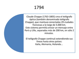 Este documento resume la historia de los principales medios de comunicación a distancia, desde el telégrafo óptico de Claude Chappe en 1794, pasando por el primer telegrama enviado por Samuel Morse en 1844, el desarrollo del teléfono por Graham Bell en 1876 y la creación del primer correo electrónico en 1971. Explica cómo estos medios evolucionaron con el tiempo, haciéndose más rápidos, baratos y accesibles para más personas.