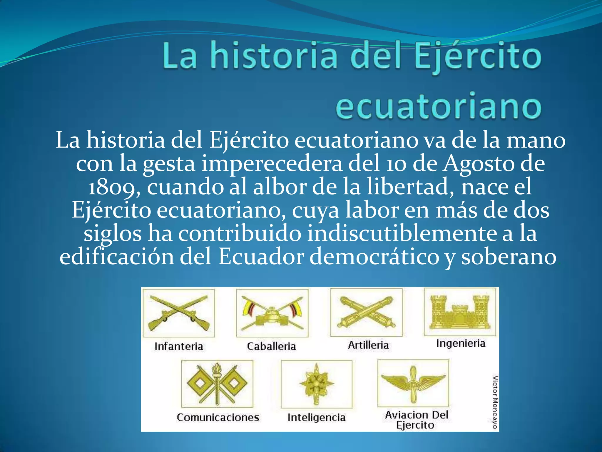 El Ejército ecuatoriano nació el 10 de agosto de 1809 durante la lucha por la independencia de Ecuador, ha contribuido a la construcción de la nación democrática y soberana durante más de dos siglos, y su historia está ligada a la gesta independentista liderada por figuras como Juan Salinas, el primer comandante, y Simón Bolívar.