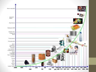 El documento resume la historia de los envases desde el Paleolítico hasta la actualidad, describiendo cómo los envases evolucionaron de formas naturales a recipientes de barro, metales, vidrio y finalmente plásticos y materiales modernos. Se destacan hitos como el desarrollo de las primeras latas metálicas en el siglo XIX, la invención del Tetra Pack en los años 1950 y la popularización del PET en las décadas de 1970 y 1980.