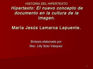 Este documento describe el origen del hipertexto. Vannevar Bush fue el primero en proponer la idea en 1945 al describir su sistema Memex, el cual permitiría vincular y navegar entre documentos de forma no secuencial. Luego, Theodore Nelson acuñó el término "hipertexto" en 1965 para referirse a documentos interconectados de forma compleja más allá del formato de papel. Ambos visionarios anticiparon características clave de los hipertextos modernos como los enlaces entre diferentes tipos de información y la navegación no