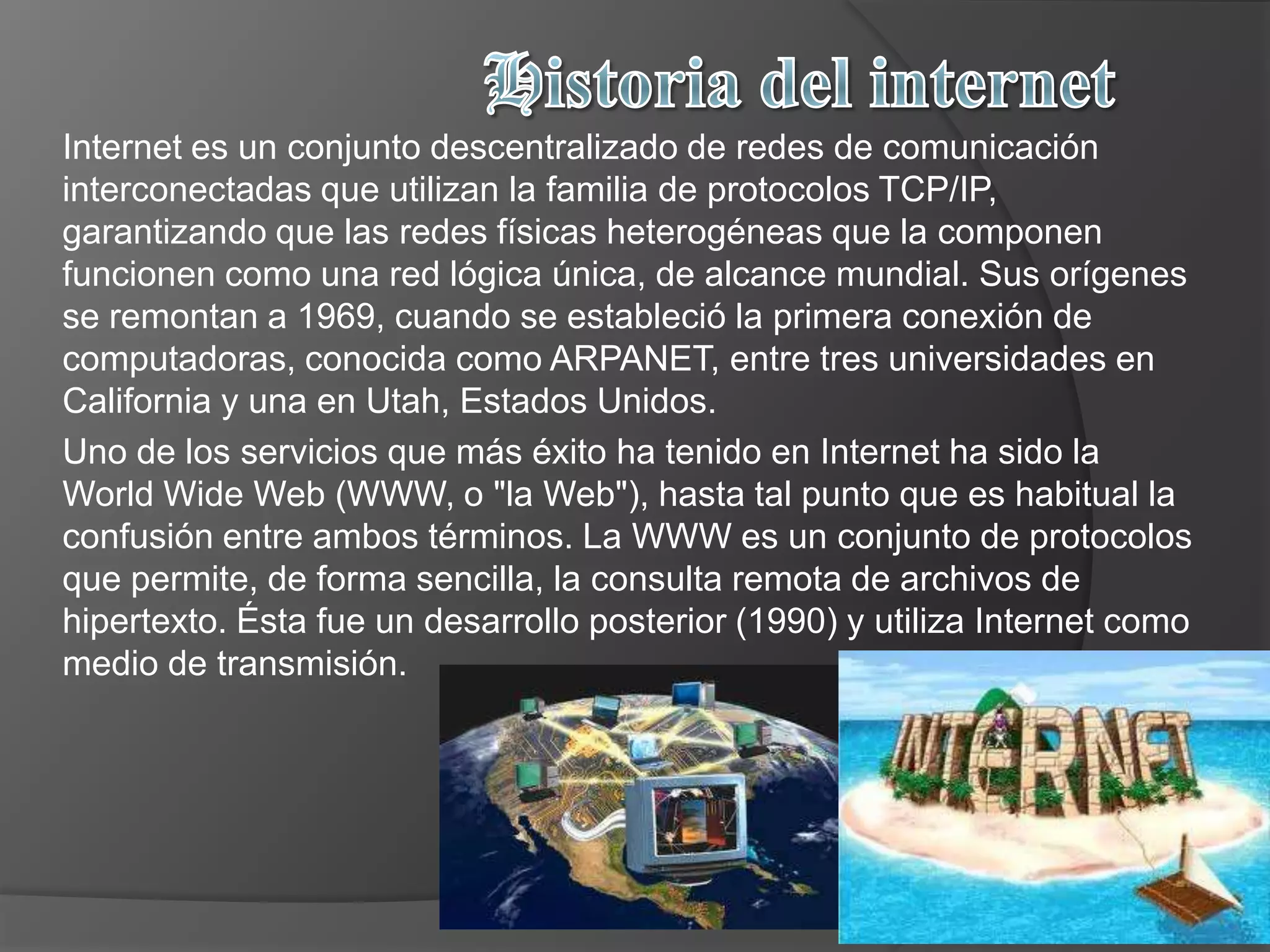 Internet es una red descentralizada de redes interconectadas que utiliza protocolos TCP/IP para funcionar como una red lógica global. Sus orígenes se remontan a 1969 con la creación de ARPANET que conectó universidades en California y Utah. Un servicio popular en Internet es la World Wide Web creada en 1990 que permite acceder fácilmente a archivos de hipertexto utilizando Internet.