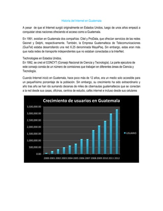 El documento resume la historia del desarrollo de Internet. Explica que Internet comenzó a desarrollarse en la década de 1960 con la creación de ARPANET por el Departamento de Defensa de EE. UU. para facilitar la comunicación militar. ARPANET creció rápidamente hasta convertirse en la base de lo que hoy conocemos como Internet. En 1991, Tim Berners-Lee creó la World Wide Web, permitiendo a más personas acceder e interactuar en Internet. Internet llegó a Guatemala en la década de 1990 y desde entonces la cantidad de usuarios