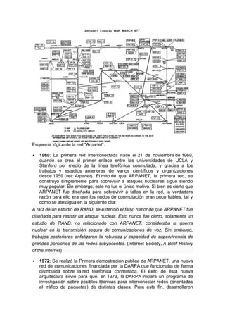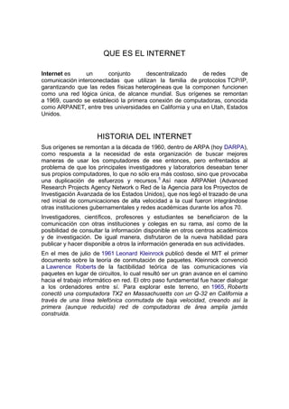 Internet es una red descentralizada de redes interconectadas que utiliza protocolos TCP/IP para funcionar como una red lógica única a nivel mundial. Sus orígenes se remontan a 1969 con la creación de ARPANET que conectó universidades en California y Utah. El desarrollo e implementación de protocolos como TCP/IP llevaron a la interconexión de más redes y al crecimiento de Internet.