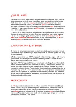 Este documento proporciona una historia general de Internet, describiendo su origen como ARPANET en la década de 1960, el desarrollo del protocolo TCP/IP, y el surgimiento de la World Wide Web en la década de 1990. Explica conceptos clave como protocolos, direcciones IP, y marcas HTML. También describe usos populares de Internet como correo electrónico, grupos de noticias, entretenimiento y búsqueda de información a través de motores de búsqueda.