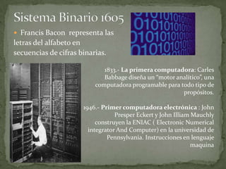 Este documento resume la historia del desarrollo de Internet desde 1833 hasta la actualidad. Algunos hitos clave incluyen la primera computadora programable en 1833, el desarrollo de ARPANET en los años 60, el envío del primer correo electrónico en 1971, el desarrollo del protocolo TCP/IP en los años 70, y el surgimiento de los principales navegadores y motores de búsqueda en los años 90 y 2000. El documento también cubre brevemente el desarrollo de Internet en México desde la década de 1980.