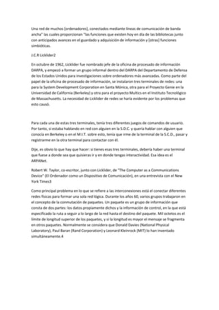 La historia del internet se remonta a las primeras redes de comunicación y la idea de una red global de computadoras propuesta por J.C.R. Licklider en la década de 1960. Implementaciones prácticas de estas ideas emergieron en la década de 1980 y la World Wide Web se popularizó en la década de 1990, extendiendo la infraestructura global de internet. Internet revolucionó la economía mundial y creó acceso sin precedentes a la información, aunque también aumentó la brecha digital.