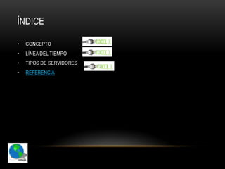 El documento proporciona una breve historia del Internet, desde sus orígenes en la década de 1940 hasta la actualidad. Explica cómo el ARPANET evolucionó hasta convertirse en Internet y destaca hitos clave como el desarrollo del protocolo TCP/IP y la invención de la World Wide Web. También resume los diferentes tipos de servidores comunes en Internet como servidores web, de correo, proxy y otros.