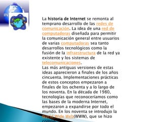 La historia del internet se remonta a las primeras redes de comunicación entre computadoras en la década de 1950, pero no fue hasta la década de 1980 que tecnologías como el protocolo TCP/IP permitieron la expansión de la infraestructura de internet a nivel mundial. En los años 1990 se introdujo la World Wide Web, lo que popularizó el uso de internet. Hoy en día, internet proporciona acceso mundial sin precedentes a la información y la comunicación, aunque también ha creado una brecha digital.