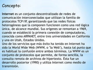 Internet se originó en 1969 como ARPANET, una red de comunicación entre universidades estadounidenses. La World Wide Web surgió en 1990 como un conjunto de protocolos que permite consultar archivos de hipertexto a través de Internet. La historia de Internet se remonta a los años 1960 cuando se estableció ARPANet para compartir recursos entre investigadores, lo que permitió la comunicación y publicación de información entre instituciones académicas.