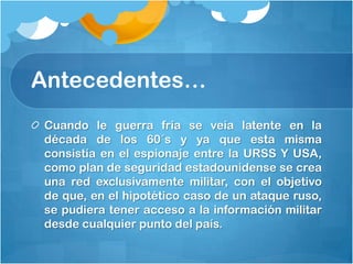 El documento describe la historia y evolución de Internet. Comenzó como una red militar estadounidense llamada ARPANET en la década de 1960 para facilitar la comunicación en caso de un ataque. ARPANET creció rápidamente y eventualmente absorbió otras redes gubernamentales y académicas para formar el embrión de Internet. En 1990, Tim Berners-Lee introdujo la World Wide Web basada en hipervínculos, lo que permitió a los usuarios navegar e intercambiar información fácilmente entre computadoras conectadas a