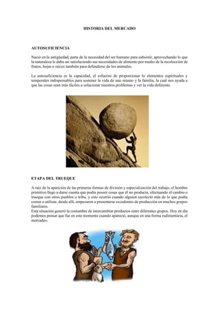 El documento resume la historia del mercado desde sus orígenes en la antigüedad hasta la actualidad. Comenzó con la autosuficiencia y el trueque, luego evolucionó hacia el uso de monedas. Más adelante, eventos como las guerras mundiales y el desarrollo de la tecnología impulsaron su crecimiento. Hoy en día, el mercado digital es cada vez más importante.