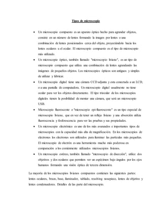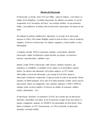El microscopio fue inventado alrededor de 1610 por Galileo o Jansen y permitió observar objetos demasiado pequeños para ser vistos a simple vista. En la década de 1660, investigadores como Malpighi y Hooke publicaron trabajos que utilizaron el microscopio para avanzar en el entendimiento de la anatomía. En el siglo XVII, Leewenhoek describió por primera vez protozoos, bacterias y otros microorganismos utilizando microscopios de su propia fabricación. Los avances posteriores incluyeron mejoras mecánicas y