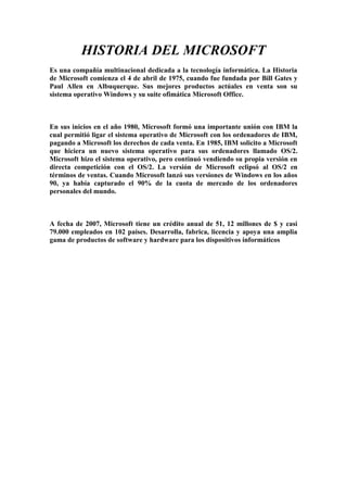 Microsoft fue fundada en 1975 por Bill Gates y Paul Allen. En sus inicios formó una importante alianza con IBM para vincular su sistema operativo con los ordenadores de IBM. En los años 90, Microsoft lanzó versiones de Windows que capturaron el 90% del mercado mundial de ordenadores personales. En la actualidad, Microsoft es una gran compañía multinacional con más de 79,000 empleados en 102 países y 51.12 mil millones de dólares en ingresos anuales.