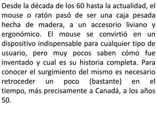 El mouse fue inventado en la década de 1950 por la Marina Canadiense como un dispositivo para mover un cursor en pantalla llamado TrackBall. En 1963, Douglas Engelbart creó el primer prototipo de mouse de madera con un botón y cable. En 1970, la empresa Telefunken comercializó el primer mouse con una bola de goma. El mouse se popularizó en las computadoras personales de Xerox en los años 1970 y Apple lanzó su primer mouse de metal en 1983. En la actualidad, los mouses ópticos y sin contacto son los más comunes.
