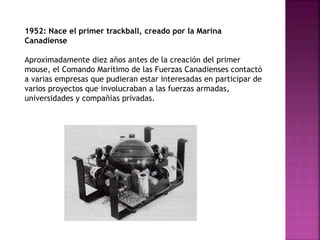 El primer trackball fue creado por la Marina Canadiense en 1952, mientras que el primer prototipo de mouse fue creado por Douglas Engelbart en 1963. En 1970, se comercializó el primer mouse de la historia, fabricado por la compañía alemana Telefunken. Los mouses de Xerox se popularizaron en las computadoras personales en la década de 1970. En 1983, Apple lanzó el mouse de Lisa, que estableció el estándar de un solo botón. En 1999, Microsoft lanzó el primer mouse óptico comercial.