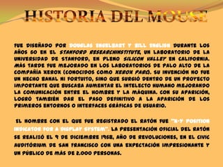 El mouse o ratón es un dispositivo apuntador utilizado para facilitar el manejo de un entorno gráfico en un computador. Fue diseñado por Douglas Engelbart y Bill English en los años 60 y mejorado en los laboratorios Xerox PARC. Recibió el nombre de "ratón" debido a su forma similar, y su funcionamiento básico sigue siendo el mismo hoy en día a pesar de los avances tecnológicos.