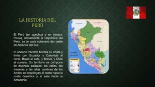 El documento describe brevemente la historia del Perú, desde el antiguo imperio inca hasta la actualidad. El Perú se ubica en América del Sur y limita con Ecuador, Colombia, Brasil, Bolivia y Chile. Su territorio incluye valles, mesetas y montañas andinas, así como la costa desértica y la selva amazónica. La historia peruana comprende el imperio inca, la conquista española, la independencia, la era republicana y el retorno a la democracia en el siglo XX.