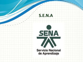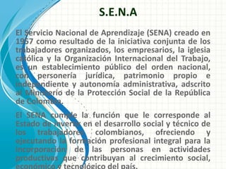 El Servicio Nacional de Aprendizaje (SENA) es una institución pública colombiana creada en 1957 para ofrecer formación profesional gratuita e invertir en el desarrollo de los trabajadores, con el fin de contribuir al crecimiento social, económico y tecnológico del país. El SENA cumple funciones como formar profesionalmente a las personas, brindar servicios de formación continua a empresas, e impartir información y apoyo para el empleo y desarrollo empresarial.
