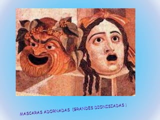 El documento trata sobre la historia del teatro, incluyendo anfiteatros romanos, teatro medieval, y teatro moderno con máscaras y teatro de verano.