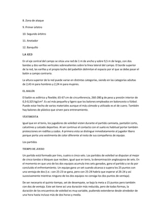 El documento resume la historia y las reglas básicas del voleibol. Se originó en 1895 en Estados Unidos y fue creado por William G. Morgan. La FIVB se fundó en 1947 y el voleibol se convirtió en deporte olímpico en 1964. El voleibol se juega entre dos equipos de seis jugadores y la victoria se obtiene al ganar tres sets.