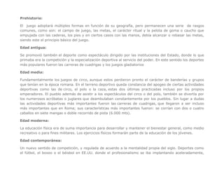 El documento presenta una línea de tiempo cronológica del deporte a través de los tiempos. En la prehistoria, el juego adoptó diferentes formas según la geografía pero manteniendo rasgos comunes como el campo, las metas y el uso de una pelota. En la antigüedad, el deporte se promovió como espectáculo estatal donde primaba la competición. En la Edad Media, los juegos de circo y actividades como las carreras de cuadrigas eran populares. En la Edad Moderna, la educación física form