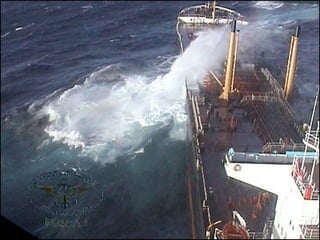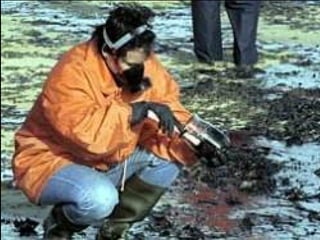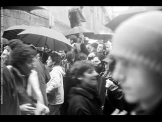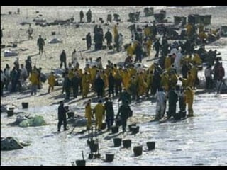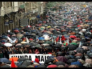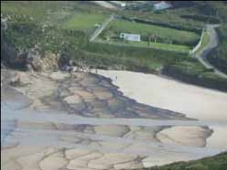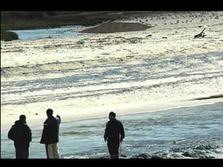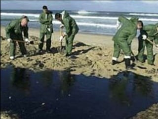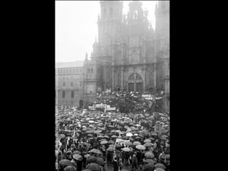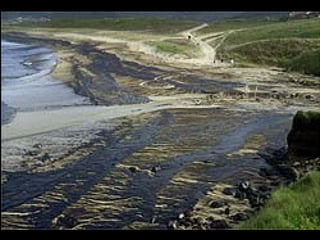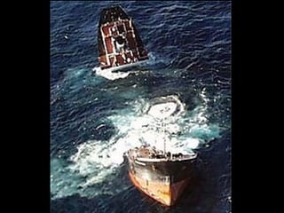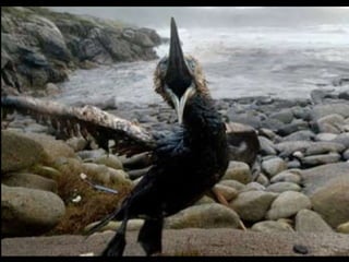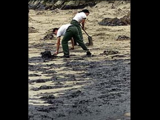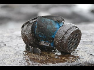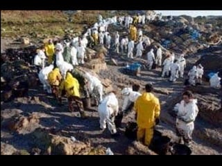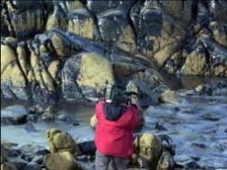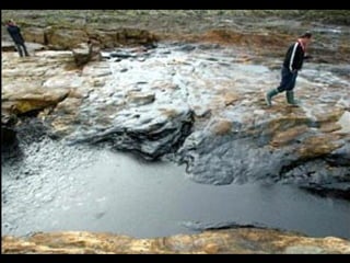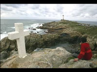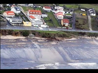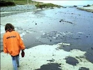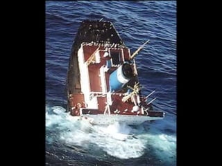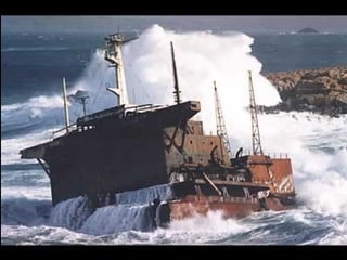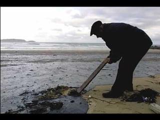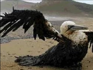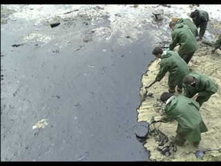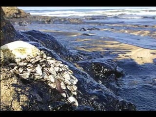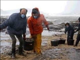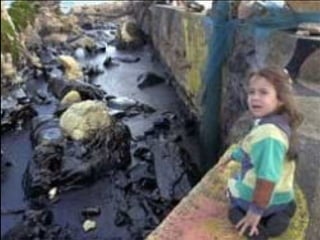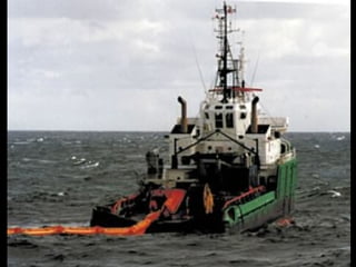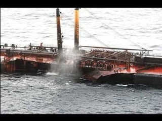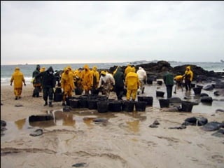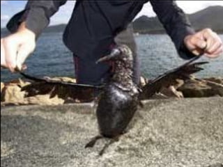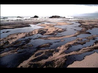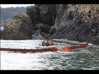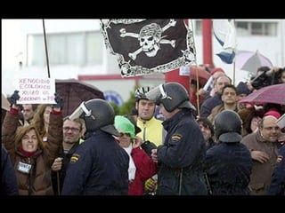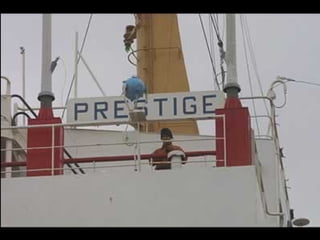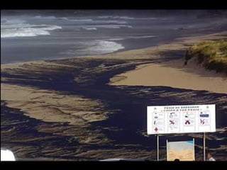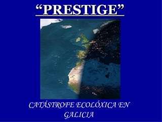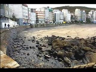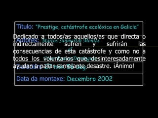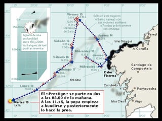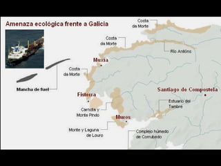 El documento describe la catástrofe ecológica causada por el hundimiento del petrolero Prestige frente a las costas de Galicia en 2002, incluyendo detalles sobre el barco, su carga y propietarios. También resume las declaraciones contradictorias de funcionarios del gobierno sobre el vertido y sus consecuencias, y destaca que Galicia ha sufrido varios desastres similares en el pasado debido al intenso tráfico marítimo en la zona.