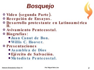 El documento describe el desarrollo del protestantismo y el pentecostalismo en Latinoamérica. Explica que el pentecostalismo surgió en Estados Unidos a principios del siglo XX y luego se extendió a Latinoamérica, llegando a Chile en la década de 1930. También presenta biografías de dos líderes pentecostales pioneros en Chile: Juan Canut de Bon y Willis C. Hoover.