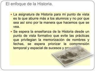 El documento discute cómo enseñar historia de una manera más efectiva. Señala que la historia debe enseñarse desde un enfoque comprensivo en lugar de la memorización de datos. También destaca la importancia de que los estudiantes analicen eventos desde perspectivas económicas, sociales, políticas y culturales para comprender mejor el contexto histórico. Además, enfatiza el papel fundamental del maestro en despertar el interés de los estudiantes y utilizar recursos didácticos variados.