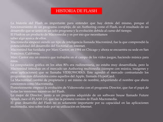 El documento describe la historia y funcionalidad del programa Flash. En pocas oraciones: Flash comenzó como un programa creado por Macromedia para crear contenido interactivo y multimedia para la web, ha evolucionado a través de varias versiones añadiendo nuevas funciones como soporte para programación y compatibilidad mejorada con navegadores, y permite a diseñadores crear animaciones e interactividad para páginas web.