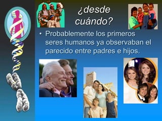 Este documento presenta un resumen breve de la historia de la genética. Comienza con las primeras observaciones de parecido entre padres e hijos y la domesticación de animales y plantas. Luego describe las primeras teorías griegas sobre la herencia, incluidas las de Hipócrates, Aristóteles y Empédocles. Más adelante señala avances como la teoría de la epigénesis de William Harvey y la teoría de la evolución y la pangénesis de Charles Darwin. Finalmente, menciona las contribuciones de August