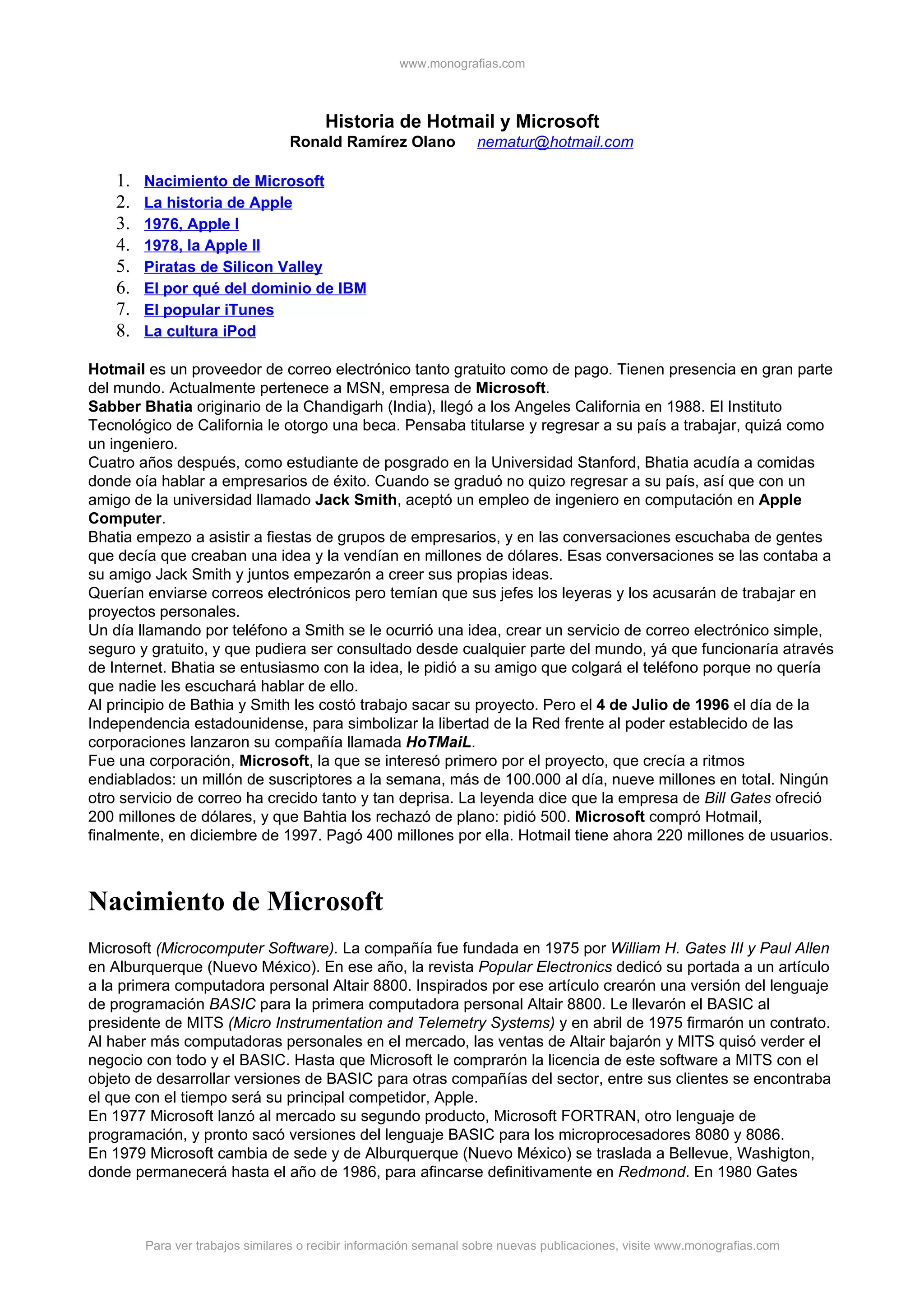 El documento proporciona una historia detallada de Hotmail y Microsoft. Hotmail fue fundado en 1996 como un servicio de correo electrónico gratuito y fue adquirido por Microsoft en 1997 por $400 millones. El documento también describe la historia de Microsoft desde su fundación en 1975 hasta sus productos y batallas legales más recientes. Finalmente, ofrece una breve historia del nacimiento de Apple y sus fundadores Steve Jobs y Steve Wozniak.