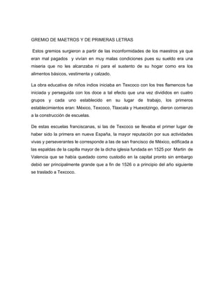 El documento trata sobre la educación en México en diferentes épocas. Describe cómo se enseñaba a los niños en el pasado a través de consejos de los padres, y cómo la educación se impartía principalmente en el hogar. También habla sobre la creación de gremios de maestros debido a las malas condiciones laborales, y sobre las primeras escuelas rudimentarias creadas para educar a los campesinos en las áreas rurales a inicios del siglo XX.