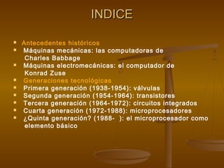 Este documento describe la evolución de las generaciones tecnológicas de los ordenadores, desde las primeras máquinas mecánicas y electromecánicas hasta los microprocesadores actuales. Se detalla la transición desde las válvulas de vacío a los transistores y los circuitos integrados, así como el surgimiento de los microprocesadores y la cuarta generación basada en ellos. Finalmente, se menciona brevemente la quinta generación y las tendencias actuales hacia la computación paralela y las conexiones entre sistemas.