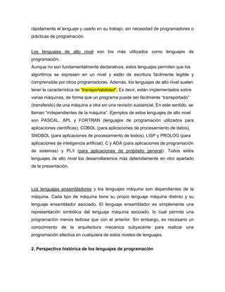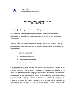 Este documento describe la historia y tipos de lenguajes de programación. Explica que hay cuatro niveles de lenguajes de programación: declarativos, de alto nivel, ensambladores y de máquina. También presenta una línea de tiempo que muestra la evolución de lenguajes importantes como FORTRAN, COBOL, ALGOL, LISP, Pascal y C a través de las décadas. Finalmente, discute brevemente las características de la sintaxis y semántica de los lenguajes de programación.