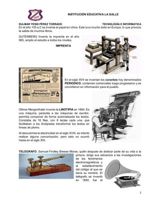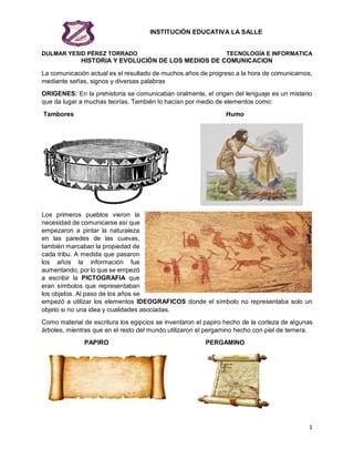 Este documento describe la historia y evolución de los medios de comunicación desde sus orígenes hasta la actualidad. Comenzó con la comunicación oral y el uso de pictogramas, y progresó con la escritura, el papiro, el pergamino y el papel. Hitos importantes incluyen la imprenta de Gutenberg, el telégrafo, el gramófono, el teléfono, la radio, el cine, la televisión y la computadora e internet. Los avances tecnológicos han permitido una comunicación cada vez más rápida y efectiva.
