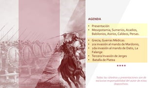 1. El documento presenta información sobre las civilizaciones que habitaron Mesopotamia, incluyendo a los sumerios, acadios, babilonios, asirios y caldeos. 2. Se describen algunos de sus logros como la escritura cuneiforme de los sumerios y el Código de Hammurabi de los babilonios. 3. También se mencionan los imperios que gobernaron la región como el Imperio Acadio bajo Sargón y el Imperio Asirio conocido por su poder militar.