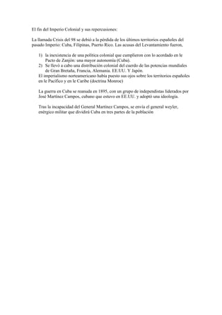 La Restauración en España supuso el restablecimiento de la monarquía bajo Alfonso XII tras el pronunciamiento del general Martínez Campos. Se estableció un sistema político diseñado por Cánovas del Castillo con dos partidos dinásticos que se alternaron en el poder de forma no democrática, utilizando el caciquismo. Se aprobó la Constitución de 1876 que establecía un régimen liberal con el Rey como jefe de Estado y las Cortes formadas por el Congreso y el Senado. La política durante esta época se caracterizó por